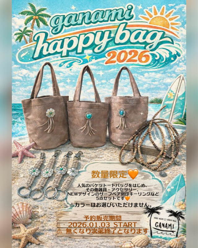2026年happybag ▶︎バケツトートバッグ(brown) コンチョカラー、デザインランダム1点 ▶︎コンチョキーホルダーフラワー3色のうち1点 ▶︎NEWサーフベア刻印キーホルダー1点 +ウッド又はビーズステンレスネックレス +その他1点 合計5点 刻印 ▶︎大文字又は小文字よりお選びいただけます 数字も可能です♡ バランスを見て刻印させていただきます。 発送は1月8日になります♡